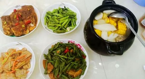 4菜一汤,标准的晚餐,是比较讲究的标准晚餐,豆角炒肉,搭配山药玉米炖排骨,再搭配几个炒菜,这应该是比较吃清淡的家人,晚餐吃清淡些,好消化又好吸收,尤其家中有老人的,可以吃些清淡,这样搭配的真不错!