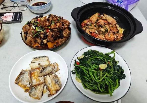 又是虾,又是炒海鲜,还有鱼,炒青菜也是不能少的,腌黄瓜也是经典菜了,那大盆的炖菜,就是晚餐的经典之做,是以海鲜为主的晚餐了,知道这个是哪地方的晚餐吗?