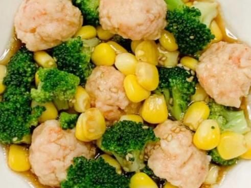 准备食材:西兰花,虾滑,玉米粒,酱汁。