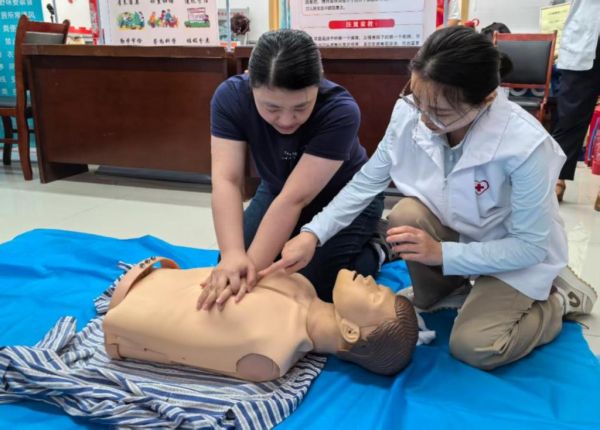 在“急救‘心’力量”环节,医护人员讲解了心肺复苏术(CPR)的操作流程、关键要点和注意事项,并指导居民在模拟人上进行胸外按压练习。同时,讲解了海姆立克急救法的操作要领,确保居民在遇到气道异物梗阻的紧急情况时能够迅速、正确地实施互救或自救。活动现场互动热烈,居民们学习热情高涨,积极投入实操练习。