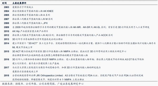 公司简述:爱康医疗于2003年在北京成立。2004年上市第一款膝关节产品,2005年上市第一款髋关节产品,2009年首家引进3D打印技术用于骨科植入物研发,2015年获得中国首张3D打印金属植入物注册证。