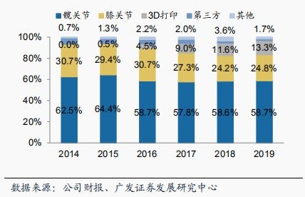 爱康医疗的产品主要分为髋关节、膝关节和3D打印。2019年,三大业务表现亮眼: