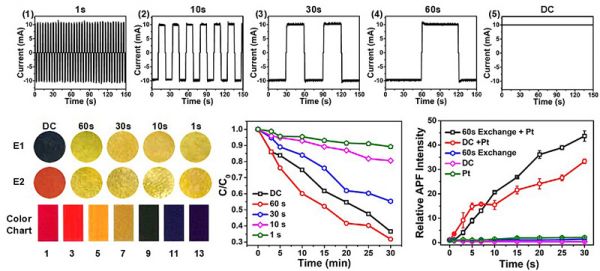 为更好地将此现象应用于小鼠肿瘤模型,减少电极本身对组织的损伤,作者探究了方波交流电场对反应的影响。结果发现,随着方波周期的降低,铂纳米颗粒产生羟基自由基的量越少。其中周期为120 s时,铂纳米颗粒对亚甲基蓝的降解效果与直流电场相当。