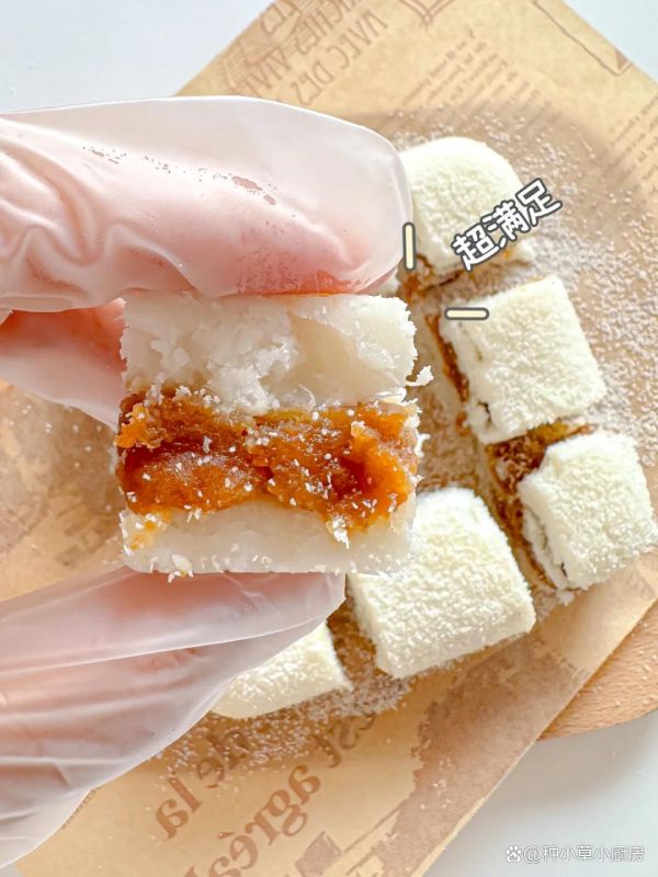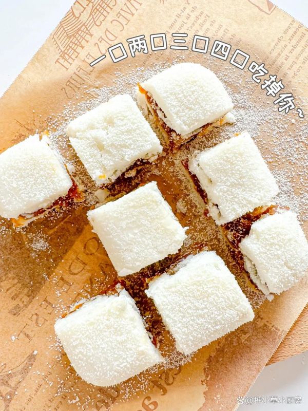 4、把做好的糕体放入冰箱冷藏一会儿,等它完全冷却后,脱去保鲜膜,撒上一层米粉或者椰蓉,然后切成小块,就可以享用了。