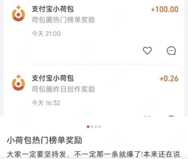 为了这个目标,阿里也是很舍得花钱,在“小荷包”荷包圈里,点赞或者被打赏,都有可能会有现金奖励,更夸张的:分享账单或者内容上了热门榜单,还有官方额外的创作奖励,50甚至100的发。