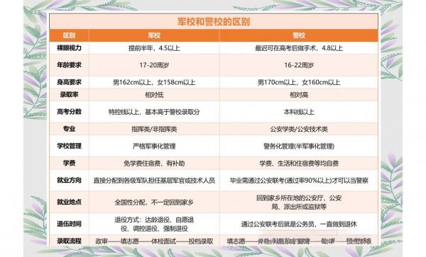 军校和警校,这两者虽然都肩负着培养优秀人才的重任,但在培养目标、课程设置以及职业路径上却有着显著的差异。接下来,我们将深入探讨这两类学校的不同之处,为您揭秘它们各自独特的魅力所在。