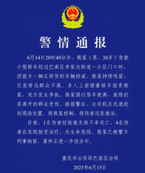 据媒体报道,2025年6月14日晚20时40分许,在重庆巴南区李家沱街道一小区门口发生了一起恶意交通事故,致1人死亡,4人受伤。悲剧的原因令人痛心,发人深省。