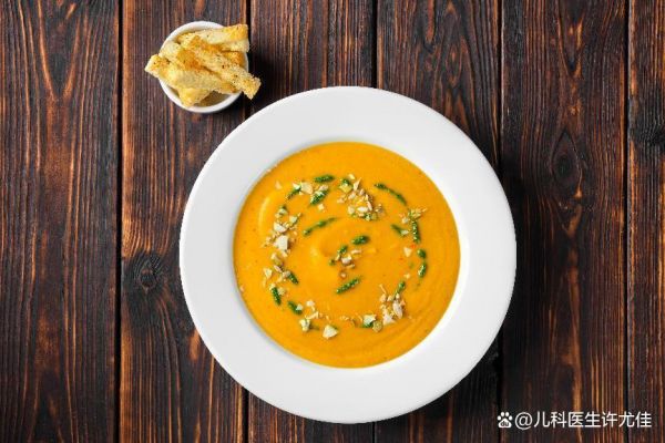 南瓜汤:准备南瓜30g,番茄30g,去皮胡萝卜10g,苹果30g,蜂蜜3g。做法:将南瓜、番茄、胡萝卜、苹果切块,加适量水,炖煮半小时,加蜂蜜调味即可。给孩子喝这个,能健脾,祛湿,排毒。