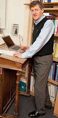 约翰·巴克利演示使用笔记本电脑站立工作的姿势