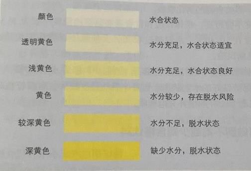 ③ 尿液颜色健康成年人的正常尿液颜色是略带黄色透明。呈现较深黄色和深黄色时,提示机体水分不足或缺少水分,处于脱水状态。