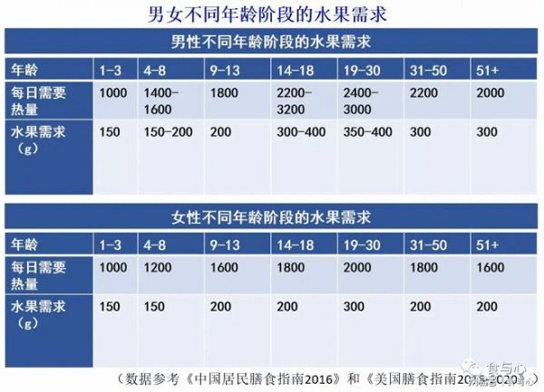 也就是说,一般情况下,女性1-8岁间,每天150克水果就可以了,9-18岁间每天需要200克,19-30岁每天需要300克,31岁之后每天200克水果就够了;男性1-3岁间每天需要150克水果,4-8岁间需要150-200克,9-13岁需要200克,14-18岁需要300-400克,19-30岁需要350-400克,31岁之后每天300克水果就可以了。