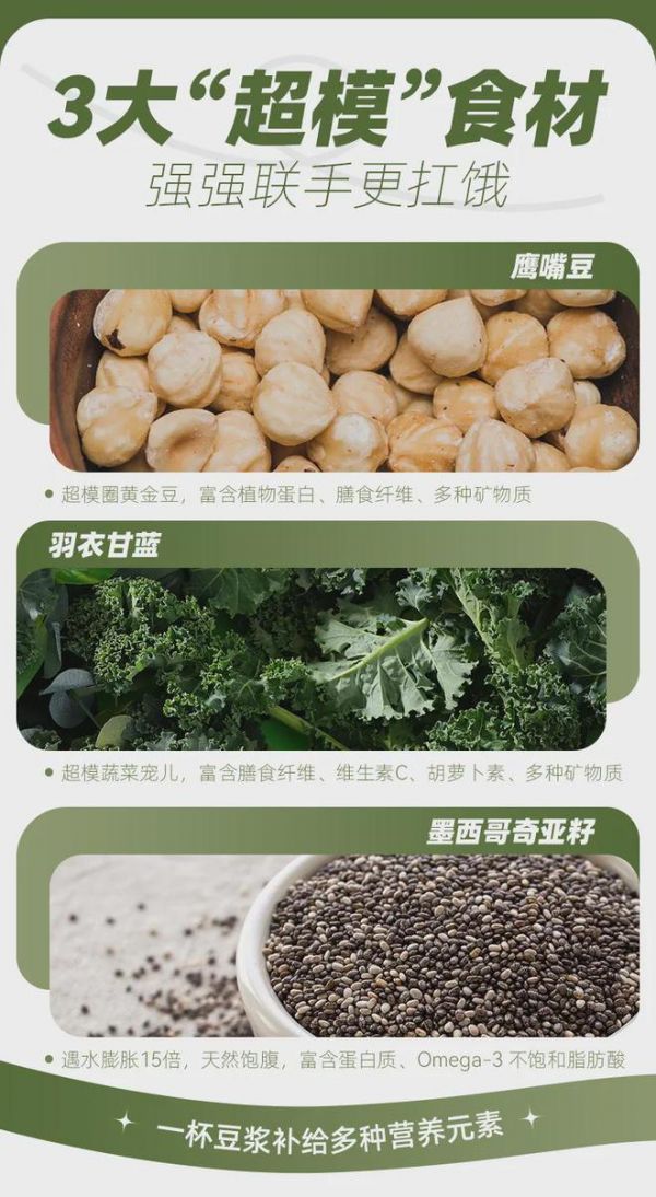 除了在基底上有创新,还实现了3大“超模”食材强强联手:超模圈黄金豆鹰嘴豆、超模蔬菜宠儿羽衣甘蓝、墨西哥奇亚籽,九阳豆浆自律搭子营养标准更高,热量和脂肪更低,饱腹感更强,精准契合现代人对健康饮食、科学减重的双重需求。