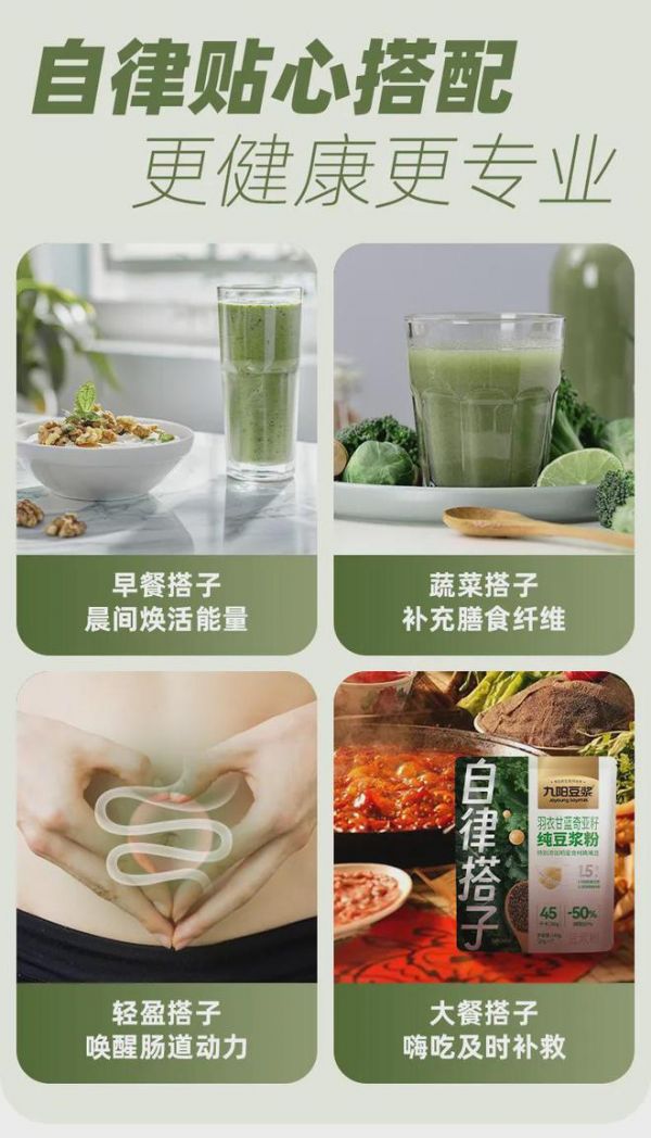 九阳豆浆精准捕捉年轻人需求,从每天都需要吃的早餐开始,匹配年轻人生活化减肥场景,打造了新的自律方向。「自律搭子」率先创新研制大豆+鹰嘴豆纯豆浆粉基底,把健康低热量的超级食材进行了本土化的演绎,推出了两款差异化产品——鹰嘴豆大豆纯豆浆粉和羽衣甘蓝奇亚籽纯豆浆粉。