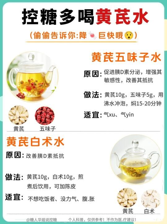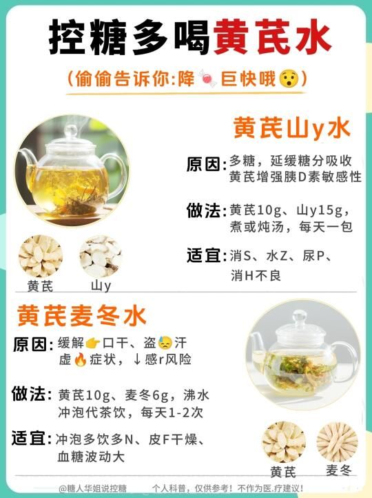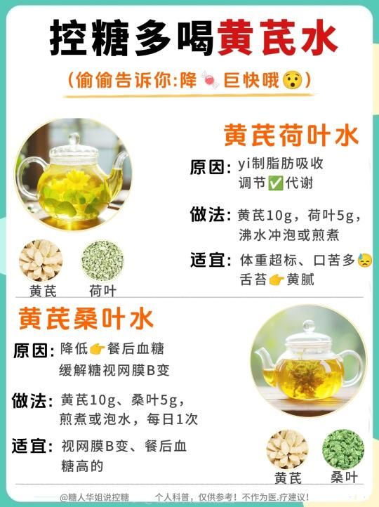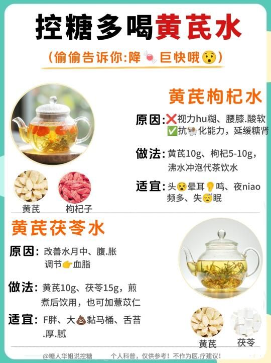 糖友们有福了!黄芪水10种神仙喝法,控糖的家人们也可以喝出幸福感❗️ . 糖友们!挖到一杯能喝的“控糖宝藏”啦~ 糖尿病饮食不用再每天只能喝白开水!控糖期间,家人们也可以不再与美味绝缘! . 黄芪水真的太神奇了❗️10种神仙CP亲测好喝又安❤️,三高家庭/高糖人/熬夜党快来抄作业 . ㊙️我的黄芪水万.能公式 ✨黄芪片10g+任一种食材5-15g+沸水焖泡 (血糖稳定期可加红枣1颗,但不要加糖!) . 10款黄芪水搭配,建议⭐️收藏 1⃣黄芪+山y ——健pi扛饿不发xu ✨富含多糖,延缓糖分吸收 增强胰D素敏感性。 . 2⃣黄芪+麦冬 ——嗓子哑星,润到❤️坎里 ✨调节免yi功能,减少/感ran风险。 . 3⃣黄芪+葛根 ——控糖期稳定ji,美食自由get~ ✨促进胰D素分泌,增强胰D素敏感性。 . 4⃣ 黄芪+枸杞 ——明又养fa,朋友夸我“发光” ✨bu月干shen,抗化 . 5⃣黄芪+白术 ——shi气重必试,脸不月中腿不粗 ✨改善胰D素抵抗∽ . 6⃣ 黄芪+五味子—— 护月干小能手,熬夜不脸黄 ✨促进胰D素分泌, 增强其敏感性 ,改善其抵抗∽ . 7⃣ 黄芪+荷叶 ——清爽无fu担,夏天喝像在喝冰水∽ ✨yi制脂肪吸收,调节代谢 . 8⃣黄芪+桑叶—— 降压小帮手,高压人喝了直 ✨⬇️血糖,护 . 9⃣黄芪+丹参 ——血管年轻态,手脚bing凉改善中∽ ✨改善微循环,预fang糖并发∽ . 黄芪+茯苓 ——睁眼党终于睡到天亮 ✨健pi利shi,调节血脂 . 糖友专属小贴士: ✅材料优选“切片包装”✅超方便 ✅放一会儿,冰箱冷藏后冰镇喝,口感升级! ✅搭配粗粮饭,事半功倍,悄悄瘦~偷偷降∽ . ⚠️⚠️温馨提示: ∽千人千糖 ,不同X果情况很正常,建议饮用时,刚开始从少量开始测试血糖变化哦~ ∽你的私藏控糖搭配是啥?赶快留言交出来!❤️