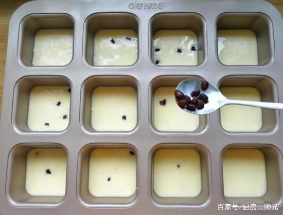 4、 把搅好的面糊倒进模具里面,磨具要事先准备好,方格或者花型都可以。倒入的时候不要太满,想一下做出来的蜜豆年糕的厚度。大概只要倒入磨具的四分之一就可以了。