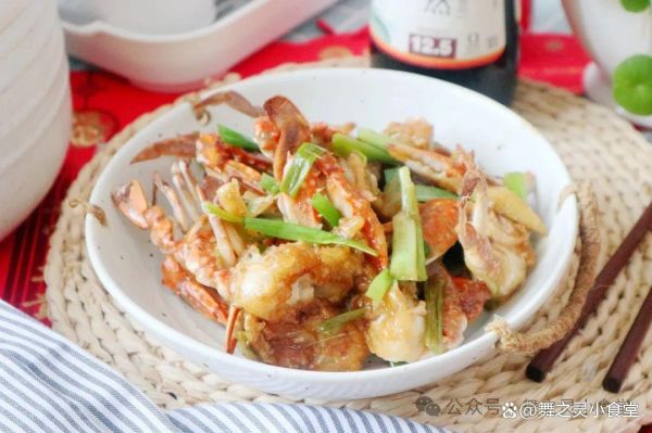 第三步:把提前准备好的适量葱姜放入锅里面(油少许即可),接着爆香。然后把螃蟹倒入,同时加入少许的酱油、料酒和胡椒粉,还可以放1小勺的水,大火翻炒均匀入味,最后撒入香葱段就可以食用了