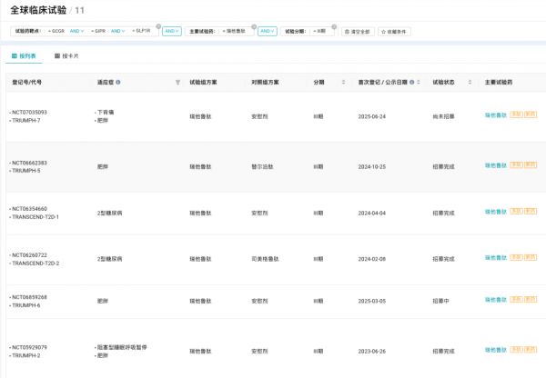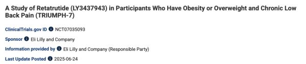 当地时间 6 月 24 日,礼来在 ClinicalTrials.gov 网站上登记了一项评估瑞他鲁肽(Retatrutide、LY3437943)在肥胖或超重伴慢性腰痛患者中疗效和安全性的 III 期临床研究(TRIUMPH-7,登记号:NCT07035093)。