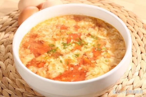 番茄鸡蛋汤:番茄两个,鸡蛋一个,葱花适量。番茄切块,鸡蛋打散。锅中热油,放入番茄翻炒出汁,加入适量水烧开,倒入鸡蛋液搅拌均匀,加盐、葱花调味。