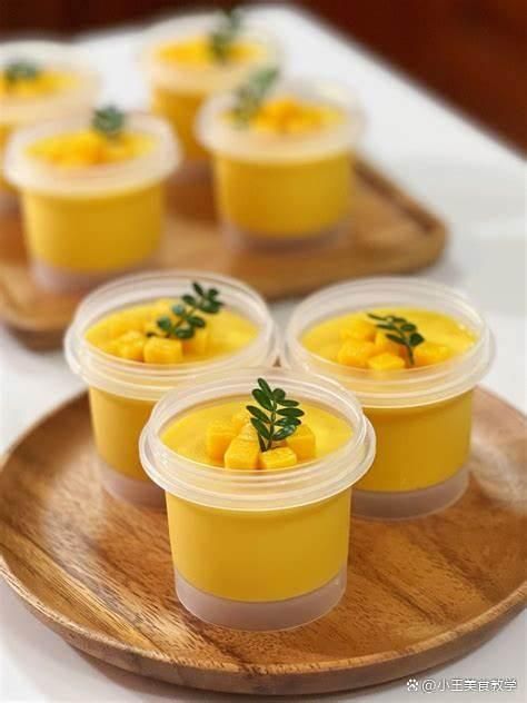 芒果布丁:芒果一个,牛奶、吉利丁片适量。芒果切块,吉利丁片用冷水泡软。牛奶加热,放入吉利丁片搅拌至融化,加入芒果块,倒入模具中冷藏凝固。