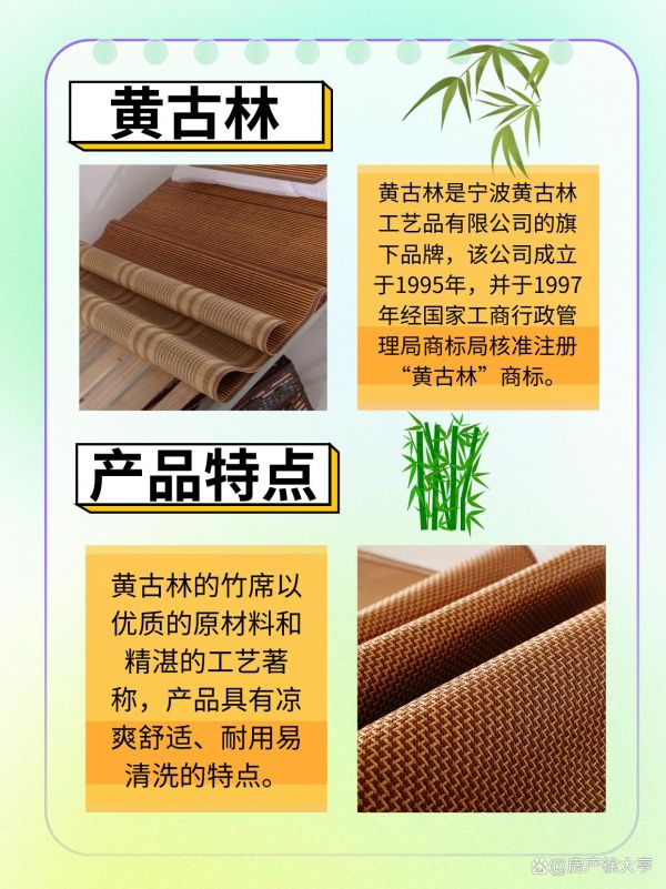 产品特点:黄古林的竹席以优质的原材料和精湛的工艺著称,产品具有凉爽舒适、耐用易清洗的特点。同时,该品牌还注重环保和健康,使用无甲醛粘合剂等环保材料,确保产品的安全性。