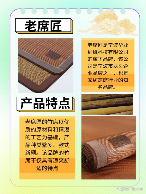 产品特点:老席匠的竹席以优质的原材料和精湛的工艺为基础,产品种类繁多、款式新颖。该品牌的竹席不仅具有凉爽舒适的特点,还注重产品的耐用性和实用性。同时,老席匠还注重产品的创新研发,不断推出符合市场需求的新产品。