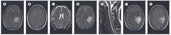 入院时 MRI 如图 A~E,依次为:T2-FLAIR、增强 T1WI、ADC、DWI、T2WI;血浆置换后 MRI 如图 F、G,依次为:T2-FLAIR、增强 T1WI