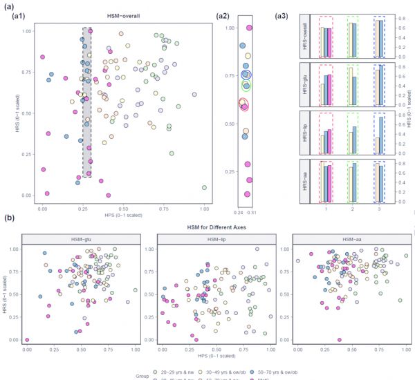 为了更全面地评估个体的代谢健康状况,研究团队创新地整合了空腹与进食后的动态数据,从而构建了一个全新的量化模型——“健康状况图谱”(Health State Map, HSM)。这一模型不仅能反映个体在空腹时的健康状况,还能评估其餐后的代谢稳态恢复能力。通过综合分析这两种指标,我们可以更清晰地观察到人群间的差异,并为个体提供更为精准的健康管理建议。