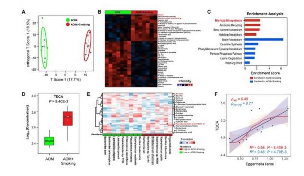 图3 注释:香烟烟雾会改变粪便中与肠道微生物群相关的代谢物。(A)OPLS-DA法AOM+吸烟组与AOM组粪便代谢谱存在显著差异,OPLS-DA法为识别不同组间的可辨别模式而进行的监督多元回归分析。x 轴捕获组之间的变异,而 y 轴捕获组内的变异。(B)AOM +吸烟组和AOM组之间的差异代谢物,双尾Mann-Whitney U试验。(C)AOM+吸烟组和AOM组差异代谢物的富集分析。(D)采用靶向质谱法p<0.05,双尾学生t-0-05测定AOM+吸烟组和AOM组粪便中TDCA的浓度。(E)通过部分斯皮尔曼相关性对细菌与差异代谢物进行关联分析。(F)TDCA和Eggerthella lenta之间的线性关联,通过线性模型进行校正和不进行校正(烟雾暴露/无烟雾)。AOM,偶氮甲烷;OPLS-DA,正交偏最小二乘判别分析;TDCA,牛磺酰氧胆酸。