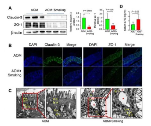 图4 注释:香烟烟雾会损害肠道屏障功能。(A)通过蛋白质印迹在AOM处理的小鼠结肠中claudin-3和ZO-1的蛋白质表达。(B)通过免疫荧光染色在AOM处理的模型的结肠中claudin-3和ZO-1的蛋白表达。(C)AOM处理的小鼠结直肠肠屏障结构的代表性图像。箭头指向电子显微镜下的细胞-细胞液络部。(a) 紧密连接;(b) 粘附液络部;(c) 脱臀体;(四)间隙结。星号表示细胞连接中断。(D)AOM和AOM+吸烟组小鼠血清中的LPS浓度。数据表示为均值±SD.统计显著性由未配对的学生 t 检验确定。AOM,偶氮甲烷;4′,6-二脒-2-苯基吲哚;LPS,脂多糖。