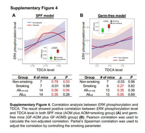 为了确定微生物群与代谢物的潜在关联,通过部分Spearman相关性进行了细菌和代谢物之间的相关性分析。观察到E. lenta与TDCA具有最积极的相关性,而两种益生菌在烟雾暴露的小鼠中耗尽的L. jensenii和L. crispatus与TDCA呈负相关(图3E)。E. lenta具有去除原代胆汁酸的能力,并表达胆汁酸差聚酶3β-羟基类固醇脱氢酶(3β-HSDH);因此,它参与次级胆汁酸合成并影响粪便中TDCA的水平。因此,我们测量了编码3β-HSDH酶的基因的丰度,并且与无烟小鼠相比,观察到烟雾暴露的基因丰度显著更高(补充图3C)。与此相一致,我们进一步证实了E. lenta的丰度与粪便中TDCA的浓度呈正相关(图3F)。因此,肠道微生物生态失调和改变的代谢物可能共同作用,促进结肠肿瘤发生。