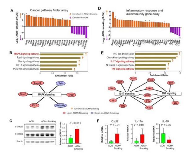 图5注释:香烟烟雾增强结肠上皮中致癌 MAPK/ERK 通路和促炎通路的表达。(A)通过小鼠癌症通路查找器PCR阵列分析,AOM+吸烟组结肠上皮表达基因与AOM组的差异表达基因(FC=AOM+吸烟/AOM阳性log2(FC)=AOM+吸烟组高表达,阴性log2(FC)=AOM组高表达)。包括AOM+吸烟和AOM>2之间的FC。(B) 富集分析显示,与AOM组相比,AOM+吸烟组的癌症信号通路发生了改变。箭头表示富集的方向,通过比较该途径中上调和下调的基因来计算。MAPK信号通路中的差异表达基因在网络中显示。(C) western blot检测AOM处理小鼠结肠中ρ-ERK1/2的蛋白表达。(D) 通过小鼠炎症反应和自身免疫阵列分析,将AOM+吸烟小鼠结肠上皮的差异表达基因与AOM小鼠进行比较。(E) 富集分析显示,与AOM组相比,AOM+吸烟组的炎症信号通路发生了改变。TNF和IL-17信号通路中的差异表达基因在网络中显示。(F) 定量RT-PCR检测Cxcl2、Il-17a和Il-10的基因表达。统计显著性由双侧非配对Student t检验确定。通过FDR调整p值(补充表2,3)。AOM,偶氮甲烷;ERK,细胞外信号调节蛋白激酶;FC,折叠变化;Il,白细胞介素;MAPK,丝裂原活化蛋白激酶;RT-PCR、逆转录PCR;TNF,肿瘤坏死因子。