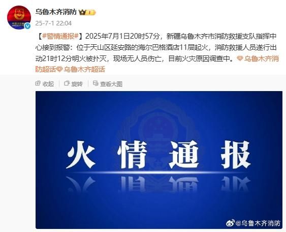 乌鲁木齐市消防救援支队通报“一酒店起火”:明火被扑灭,无人员伤亡