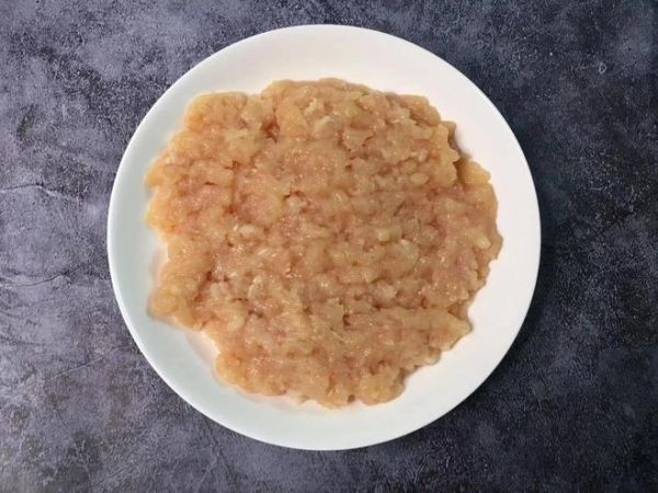 第一步:鸡胸肉洗净后剁成细腻的肉末,然后装入盘中备用。