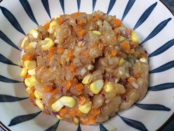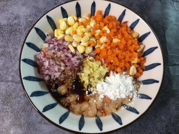 第三步:接着把鸡胸肉末、玉米粒、胡萝卜丁和洋葱丁一起倒入一个大碗中,再加姜末,一勺玉米淀粉,一勺生抽、半勺老抽、一勺料酒、一勺蚝油和一勺胡椒粉。