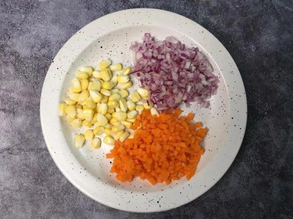 第二步:先准备半根胡萝卜,去皮后切片切条,再切成萝卜丁,洋葱洗净后切成条再切成丁,再准备玉米粒,将这3样食材装入同一个盘中备用。