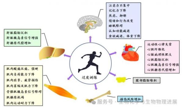 过度训练可对骨骼肌、关节、骨、心脏、肝脏和肾脏等器官,以及神经、内分泌、免疫、呼吸和消化等系统造成损害,导致运动表现持续下降及慢性不良适应,并引发多器官、组织和系统功能障碍或衰竭,以及神经内分泌功能紊乱及运动免疫抑制等一系列严重健康损害,甚至增加病原体感染和多种疾病易感风险。但目前研究最多的主要集中在骨骼肌、肝脏、心脏和中枢神经系统等方面。