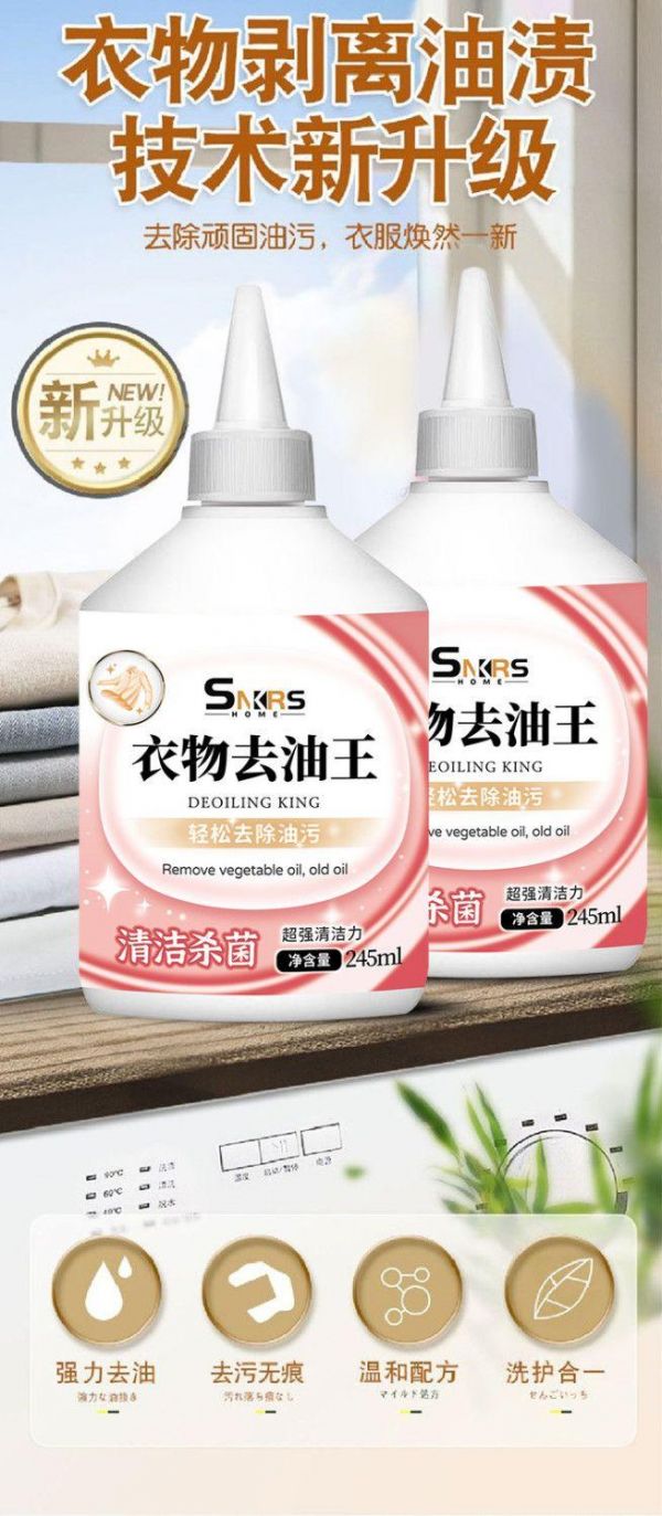 代表产品:SNKRS去油王(衣物特护款)、SNKRS白衣还原剂(多重活性剂配方)核心特性:添加脂肪酶、淀粉酶等生物酵素,能分解食用油、奶油等常见油渍,pH 值中性配方不刺激衣物纤维。适用场景:✅ 日常饮食油渍(菜汤、沙拉酱、牛奶渍等轻中度污染)✅ 棉麻 / 化纤面料的日常衣物(衬衫、T 恤、休闲裤)✅ 机洗为主的家庭批量清洁使用技巧:针对预见到的油渍(如做饭前),可先将洗衣液稀释后涂抹在领口袖口,静置 10 分钟再正常洗涤,去油效果提升 30%。