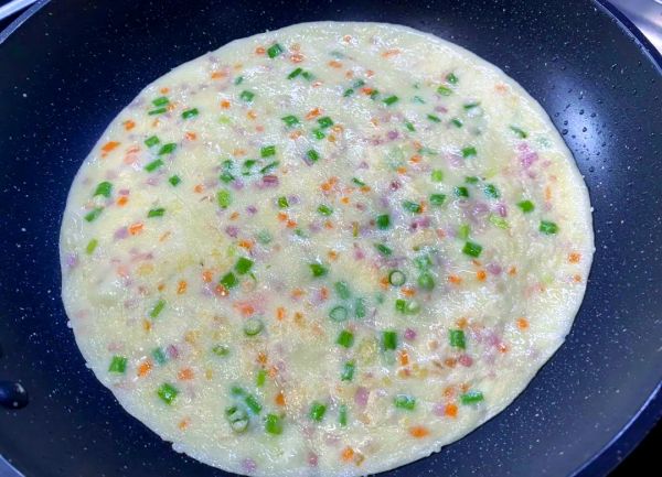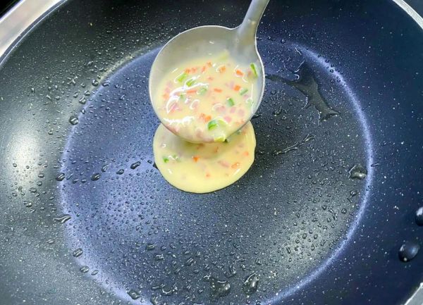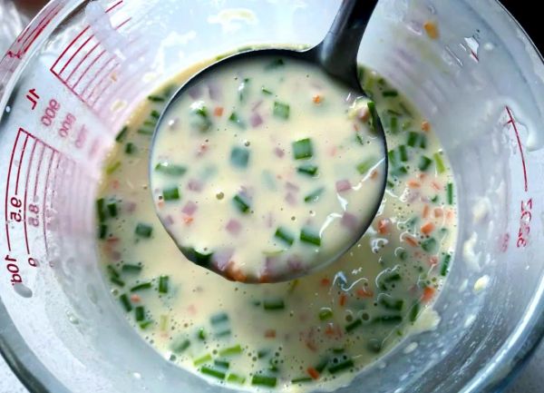 接下来,让我们详细了解一下这个无需加水的鸡蛋饼做法。首先, 准备好鸡蛋、面粉、胡萝卜、葱花和香肠等食材。接着,将鸡蛋打入面粉中,加入适量的调味料,搅拌均匀。然后,将胡萝卜切成细丝,葱花和香肠切丁备用。最后,将处理好的食材混合在一起,搅拌均匀后即可开始制作。