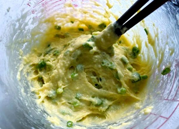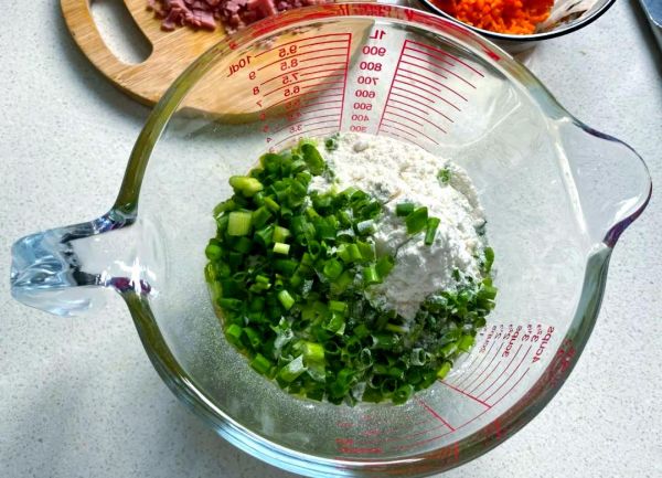 制作鸡蛋饼时,许多人通常会直接加水,这样会导致面糊出现疙瘩,搅拌不均匀。 正确的做法是,先在面粉中打入三个鸡蛋,然后撒上一些葱花,接着进行充分的搅拌,以确保面糊均匀细腻。