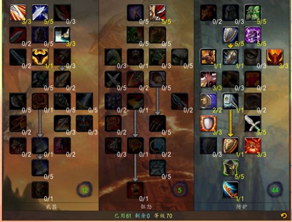 因为我所在团队,4个猎人,没小黄人和猝死战,鲁莽诅咒用的不多,所以天赋强化挫志我没有出,T5团本,MT机动任务很少,切姿态机会不多,放弃战术掌握。点出愤怒掌握,在奥,王子,瓦斯琪一类转阶段时间较长等有发呆时间的战斗中作用明显。潮汐之锤(强大的黑手光环)P2换下风剑,所以3点过路点了强化雷霆。嘲讽转换只有瓦斯琪,奥,所以没有点强化嘲讽。