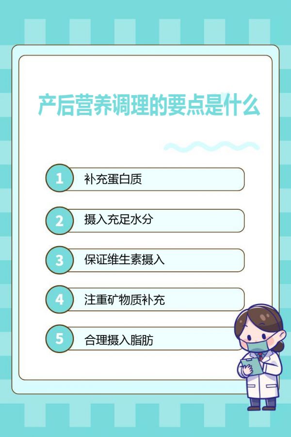 产后营养调理要点包括补充蛋白质、摄入充足水分、保证维生素摄入、注重矿物质补充、合理摄入脂肪等。