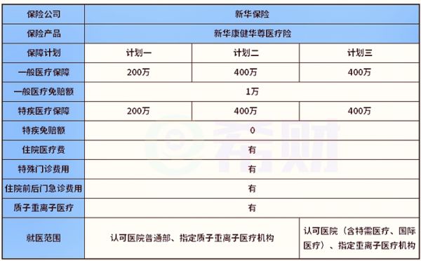 新华康健华尊医疗险共有三个保障计划,其保障内容相同,但保障额度和就医医疗机构的范围不同,具体保障详情如下: