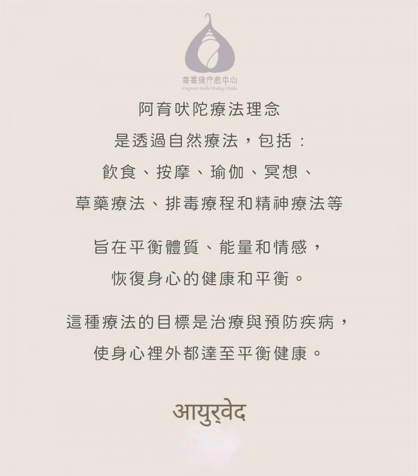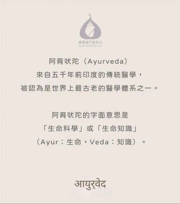 阿育吠陀 Ayurveda(梵文:3pgc)的意思为「生命与长寿的知识」,源自于数千年前的印度。这一门养生的学问,流传至今仍广泛使用着。