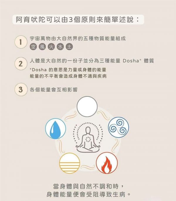 阿育吠陀中,人体和宇宙本质是相同的,宇宙就在人体内,宇宙的法则同作用于人体中。认识宇宙的组成、运行,同样也能连结人们的身心状态,令我们学习与自然调和。
