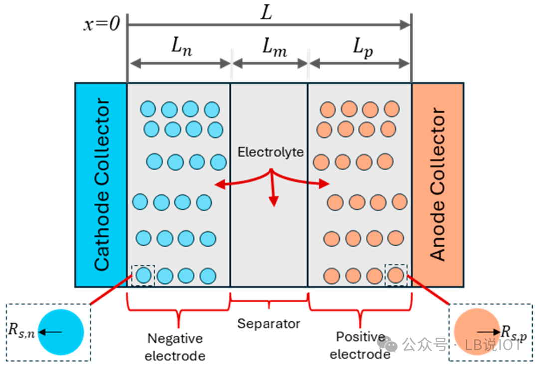DFN模型通过偏微分方程描述锂离子在充放电过程中的动态行为,涵盖电解质扩散、反应动力学、电荷与物质守恒。其为伪二维模型,分别沿颗粒半径和电极厚度方向建模,将电池分为负极、隔膜和正极三部分。模型参数物理意义明确,适合深入研究电池内部状态,但计算复杂度高,依赖大量参数识别,易出现过拟合。