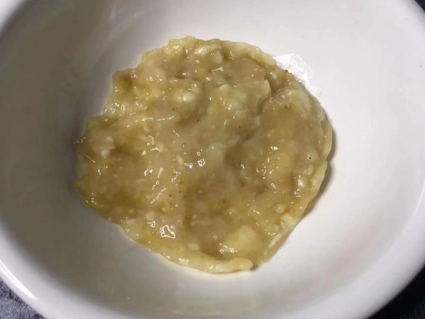 第二步:把切好的香蕉倒入大碗中,接着用勺子把香蕉压成泥。
