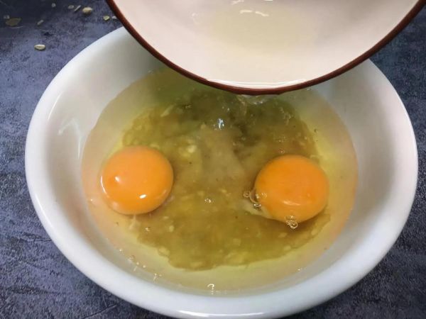 第四步:香蕉泥中打入2个鸡蛋,再倒入蜂蜜水。