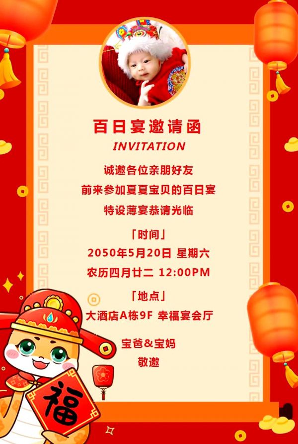 宝宝的百日标志着他们对外界感知的增强,以及对父母情感上的初步交流,这是人生的重要阶段。愿宝宝百日安康,万事如意,快乐成长!愿小宝贝聪明伶俐,成为时间的小主人,百天快乐!恭喜宝宝迎来人生的第一个100天,愿你未来一切顺心,所得皆所愿,所失皆无碍。