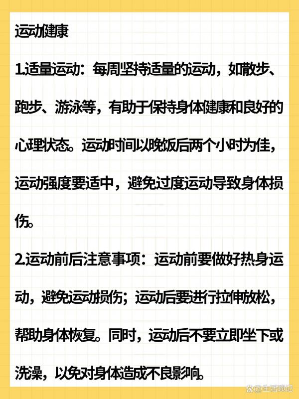 2.运动前后注意事项:运动前要做好热身运动,避免运动损伤;运动后要进行拉伸放松,帮助身体恢复。同时,运动后不要立即坐下或洗澡,以免对身体造成不良影响。