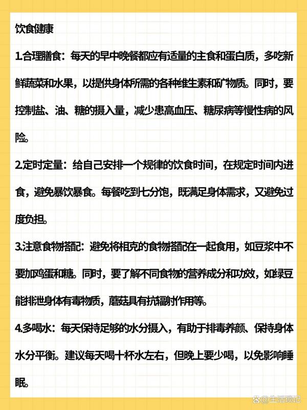 1.合理膳食:每天的早中晚餐都应有适量的主食和蛋白质,多吃新鲜蔬菜和水果,以提供身体所需的各种维生素和矿物质。同时,要控制盐、油、糖的摄入量,减少患高血压、糖尿病等慢性病的风险。